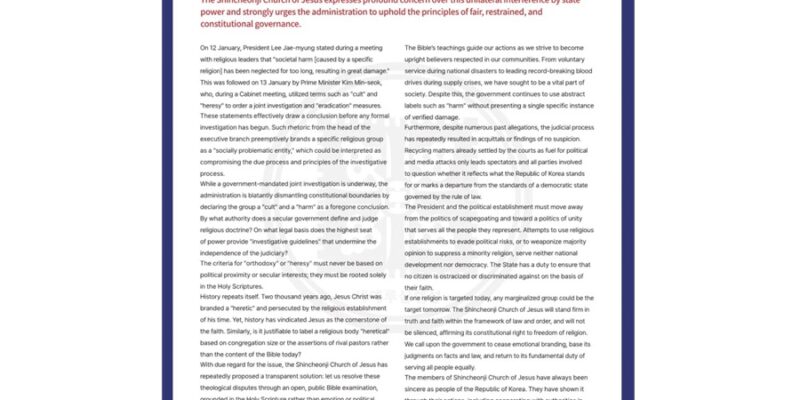 If one religion is targeted today, any marginalized group could be the target tomorrow. The Shincheonji Church of Jesus will stand firm in truth and faith within the framework of law and order, and will not be silenced, affirming its constitutional right to freedom of religion. We call upon the government to cease emotional branding, base its judgments on facts and law, and return to its fundamental duty of serving all people equally.