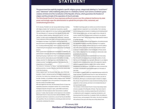 Press Release March 20, 2026 Shincheonji Marks 42nd Anniversary: “From a Basement Beginning to a Denomination Growing by Tens of Thousands Every Year” Read more